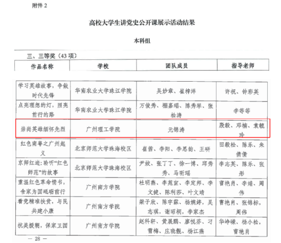 近日,广东省教育厅公布了 “高校大学生讲党史公开课活动展示活动”评选结果,122cc太阳集成游戏20造价1班元锦涛同学讲授《崇尚英雄缅怀先烈》(指导老师殷毅、邓楠、袁毓玲)获高校大学生讲党史公开课展示活动三等奖。
