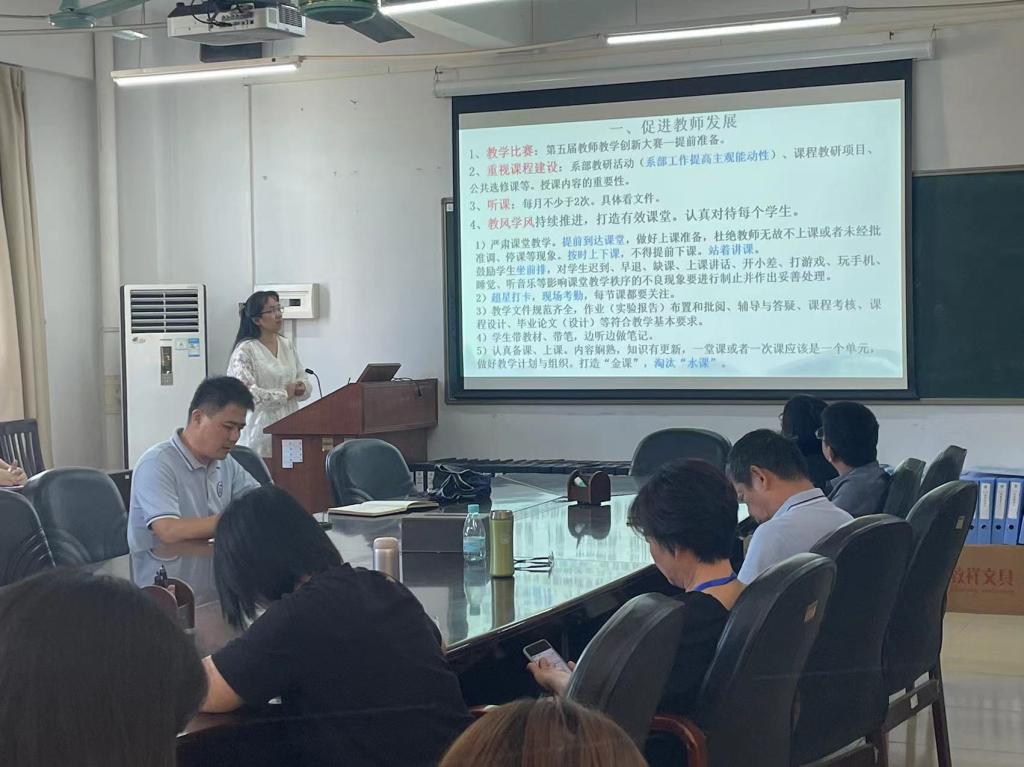 会上,杨林青副院长建议学院教师要注重自身发展,鼓励青年教师积极参加第五届教师教学创新大赛。她指出任课教师要认真备课,做好上课准备,上课期间要注重良好教学教风打造,严肃课堂纪律,课后多进行听课磨课工作,做好听课总结,提升自身教学能力。同时,教师还需关注学生动向,严格把关学生免听申请。其次,她在会上提出要规范教学资料,继续修订完善教学大纲,做好教案、课件、作业等教学资料的收集与检查工作。最后,杨林青副院长强调了在新一轮毕业设计指导工作各环节中指导教师要高度负责,全过程把控,并根据毕业设计进度安排提前部署,做到毕业论文指导工作日常化。