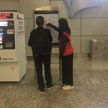 下午一点,我院地铁志愿者们开始长达四小时的志愿者工作。在此期间,我们为路线不明的乘客指引路线,搀扶行动不便的人乘坐电梯,带盲人乘坐正确的车厢,给在中国语言不通的外国友人解决困难,给遇到不会出闸的乘客进行引导,提供购票咨询及应急服务。