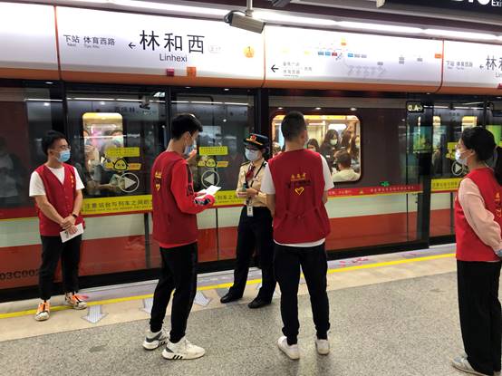志愿者们在工作人员的带领下来到地铁站内的出入站口,听从工作人员的安排,相互配合,分小组分别在自动售票机、电梯口及站台等地方进行志愿者活动。志愿者们帮助乘客使用购票机购票,引导乘客们乘车并指引路线,当看到老人和孕妇时主动向前帮助他们提重物,减轻他们的负担。