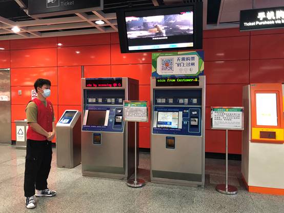 志愿者在自动售票机处做指引