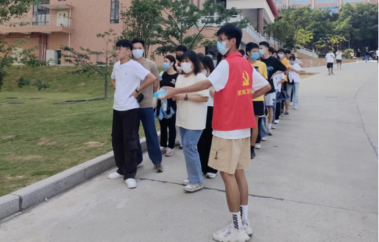 在活动前,志愿者们提前抵达学校核酸检测点,并快速投入到前期的准备工作中,为接下来的核酸检测做好充分准备。15点时,全体师生井然有序抵达检测点开展核酸检测,志愿者认真指导同学们有序排队,引导他们进入检测通道,提醒同学们要保持安全距离,做好个人防护,提前打开粤核酸小程序,提高了检测效率。在本次活动中,志愿者们分工明确,组织有序,与医护人员密切配合,营造了安全、有序、良好的检测环境,高质量地完成了本次核酸志愿服务,全面展现了我院学生党员在疫情防控中的使命担当和良好风貌。