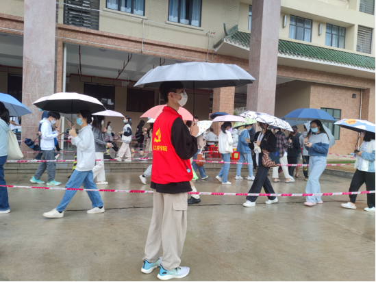 在活动前,志愿者们根据本次核酸检测相关负责人的安排,提前抵达学校核酸检测点,听从现场负责人的指挥,服从岗位安排,严格遵守工作纪律,按序展开工作。在此次校园核酸检测工作中,志愿者积极引导同学们自觉排队,提醒同学们提前打开粤核酸二维码、带好口罩、注意个人防护,保障每一项工作都严格按照防控要求落实到位。志愿者们以坚强、无畏、担当的精神诠释着青年力量于使命担当,全力守护美好安全校园,生动诠释了“使命在肩、奋斗有我”的新时代青年精神!
