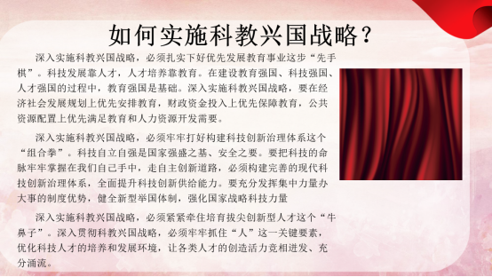 会上,魏婉珊同志从实施科教兴国战略的重要意义、为什么要学习科教兴国战略、如何实施科教兴国战略三个方面进行全面解读。同志们集体观看相关学习视频,深刻地领会党的二十大报告中关于教育、科技、人才的重要论述,进一步明白了教育优先发展、科技第一生产力、人才第一资源这三者相互依存的关系和相互转化的强大力量。