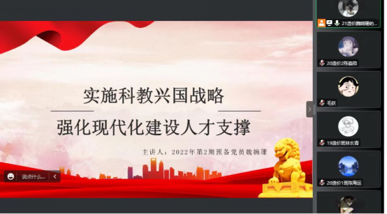 (通讯员 欧桃妍)12月15日下午,学生第一党支部按照学院党总支学习计划,以“不惧时代挑战,共建美好未来”为主题, 深入学习贯彻党的二十大精神,重点学习实施科教兴国战略,为全面建设社会主义现代化国家提供人才支撑。支部全体学生党员和党务助理线上学习,魏婉珊同志主持。