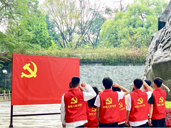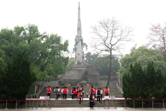 随后,同志们一行人启程广州起义烈士陵园。沿着宽阔的陵墓大道往前走,尽头便是高耸的广州起义纪念碑,这象征着中国共产党领导的广州起义冲破“三座大山”的压迫,以武装夺取政权,彰显“枪杆子里面出政权”的真理。同志们登上台阶抬头仰望纪念碑,随后学生党员和预备党员在邓小平同志亲笔题写的“广州起义烈士永垂不朽”金色大字之下重温了入党誓词。在学生党员的带领下,同志们进行了献花和默哀仪式,在整个过程中保持着庄严肃穆,表达敬仰与怀念之情。同志们在广州起义烈士陵园中聆听英烈事迹、传承英烈精神,这更加坚定了同志们的理想信念,激励着同志们沿着革命先辈的道路继续砥砺前进!