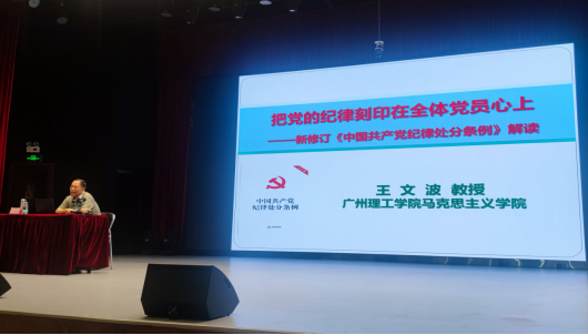 在报告会上,王文波教授结合党的历史、党的理论和党的实践,深入浅出地阐述了党纪的重要性以及党员应如何严守党的纪律。他们通过生动的案例和丰富的实践经验,让师生党员深刻认识到纪律严明是党的光荣传统和独特优势,必须始终坚持和发扬。深刻阐述了修订《中国共产党纪律处分条例》(以下简称《条例》)的重大意义,以历史的维度系统梳理了《条例》的制定及历次修订情况,并从理论联系实际的角度讲解了新修订《条例》的主要内容,通过结合一系列典型的反腐警示案例,深入浅出地阐释了《条例》所蕴含的核心要义、基本精神和丰富实践要求,为党员干部深学细悟、学懂弄通《条例》提供了重要指导。