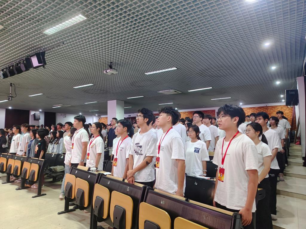 会议开始,全体起立,奏唱中华人民共和国国歌。在慷慨激昂的《国歌》声中本次开班典礼拉开帷幕。