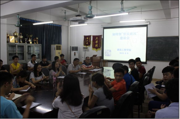 座谈会开始,首先由14级班风评比中的优秀班级总结了经验,接下来由班风评比中排名末尾的班级阐述了在班级工作中的不足;接下来13级优秀班级和末尾班级也讲述了各自的经验和不足。