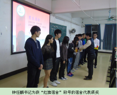 继一段关于宿舍安全宣传片后,宿管部干事林万湖给大家介绍了宿舍保修流程和阅读宿舍管理制度条例。同时宿管部部长马光华就宿舍的整体情况作了总结,对宿舍的安全、纪律、内务整理等方面的调查结果进行了公布。随后,钟任鹏书记为获得“红旗宿舍”的宿舍代表颁奖。李华东书记在会上指出,每个宿舍长要坚守职责,起带头模范作用,并强调了严禁在宿舍内使用明火、违禁电器,严禁携带烟酒、有毒、有害、易燃易爆等危险物品进入宿舍,提高警惕,注意防盗,共同营造安全、文明、和谐的宿舍环境。