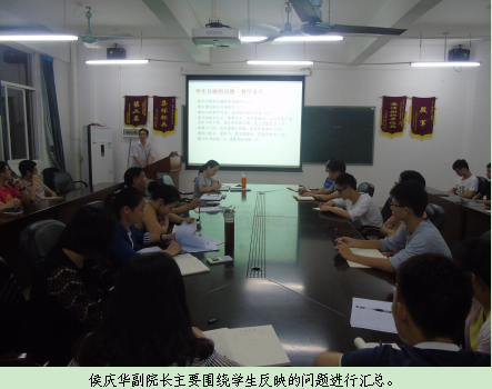 会议开始时,侯庆华副院长主要围绕学生反映关于“教学条件”、“学生管理”、“校园环境”、“生活服务”等问题进行汇总。接着,李华东书记就学生管理,后勤及学生所反应的问题进行详细的解答。他说,学校正在改善和实施可采取的意见,如宿舍安装空调,对教学楼的桌椅进行整修等。班级代表发言环节,老师们强调学生“无手机课堂”,指出现在大班教学存在很多学生玩手机的现象。同时,老师们也认真记录了学生提出的意见和建议,并当场进行解答,与学生们形成共识。最后,黄良辉副院长为座谈会做总结。他指出大学生要适应生活,独立解决问题,学校方面出现的问题,找对部门解决,提高解决问题的效率。
