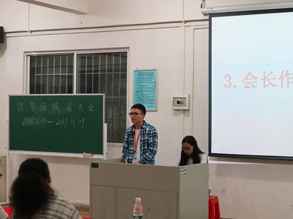 会议上,由主持人介绍了出席人员,并邀请沈艳艳老师上台致辞。她首先对上一届筑梦园的工作给予了充分的肯定,同时提到当代大学生的学习态度事宜,对筑梦园的学子们在今后的学习方面提出了几点要求。随后前任会长梁伟志作工作总结,他希望我们能把筑梦园的认真态度传承下去,发扬光大。紧接着白火云老师和理事会成员向世鹏为在过去一学年中表现突出的优秀干部颁奖。最后由新任会长邓梓明对筑梦园未来的工作作出了展望,继续加强筑梦园的建设,希望筑梦园的明天会更好!随后为新一届的干部干事举行了挂牌仪式。至此,第四届筑梦园换届大会圆满结束。