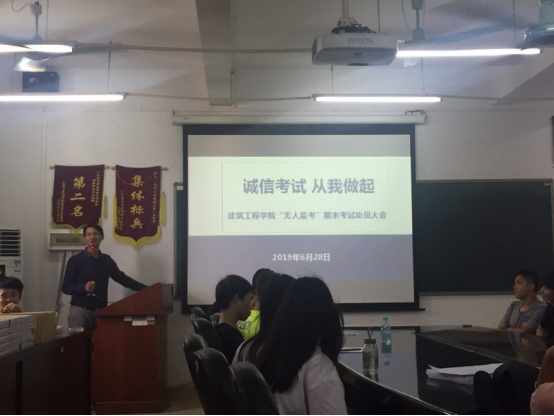 18造价1班和16工管班为我院本次期末考试的“无人监考诚信班级。在“无人监考,诚信考试”的主题班会上,郭梦雅和曾远秀老师分别给18造价1班、16工管班做诚信考试动员工作,组织班级同学认真学习考试的相关校规及诚信考试的相关内容、注意事项等。黄书记在会议做了重要讲话,他用过往部分学生违反考试校规而被处分的例子,提醒同学们要树立诚信意识,提高自我要求,做到诚信考试。他鼓励同学们认真复习,争取考出好成绩,做社会合格人才。班会后,18造价1班和16工管班全班同学在《“无人监考、诚信考试”考生承诺书》上签字。