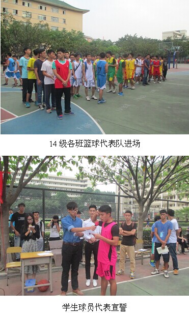 随着各班球员喊着声声铿锵有力的口号以激情昂扬的姿态入场,本届“新生杯”篮球赛正式开幕。为保证比赛的公平、公正、公开,学生裁判代表及班级球员代表分别宣誓。为了让2014级新生能够更好地了解我系篮球队的实力,2013年我们院“新生杯”篮球队的冠军队伍即我系13级系篮球队,与12级系篮球队展开了一场精彩的开幕表演赛。比赛开始,球员们迅速进入状态,不到4秒钟时间,12级代表队通过一个完美的配合,进了本场比赛的第一球,顿时把现场气氛推上了高潮。
