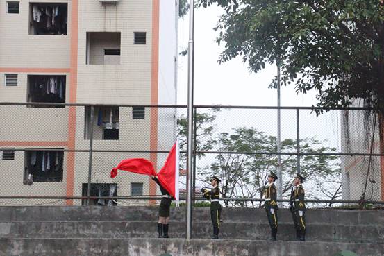 旗手们迎着朝阳,迈着整齐有力的步伐,庄严前行。伴随着铿锵有力的《义勇军进行曲》回绕整个操场,全体师生行注目礼,奏唱国歌。鲜艳的五星红旗随风飘扬,展现了建工学院学子朝气蓬勃的精神风貌,激发了同学们的爱国爱党热情。