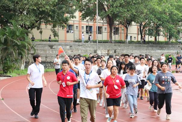 在环校跑活动正式开始前,各工作人员配合老师进行整队。随着一声哨响,我院学子在领跑的带领下正式开始环校跑。在活动中,同学们面带微笑,轻装上阵,青春激昂,迈着矫健的步伐在校道上奔跑,此外,我院还在此次环校跑途中设置了许多站点,为同学们提供饮用水、医疗用品等后勤保障,彰显了我院学子们积极向上的精神风貌与团结互助的学院氛围。