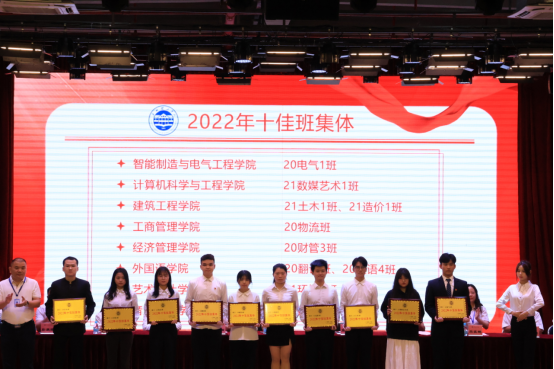 会上,团委书记彭文刚宣读了表彰文件,并对表彰个人、集体进行颁奖。其中我院21土木1班、21造价1班获评2022年十佳班集体,20造价5班、20造价6班获评2022年先进班集体,21造价1班黄正道、21土木1班何宇彬获评2022年十佳班长,20造价4班黄俊瑜、22造价1班谢浩亮获评2022年优秀班长,19造价4班易茜获评2022年大学生十大年度人物。
