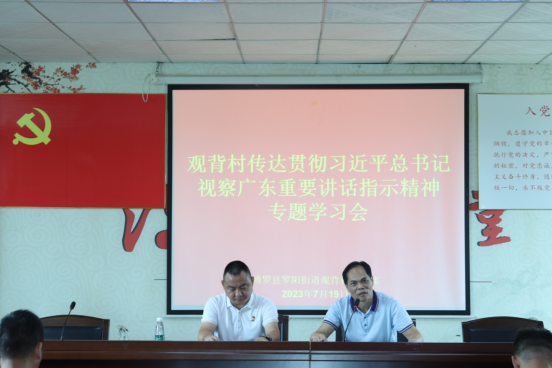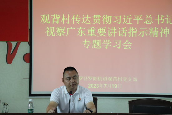 会上,观背村党支部书记郑国雄带领我们学习了习近平总书记视察广东重要讲话、重要指示精神,就推进惠州市博罗县观背村高质量发展做了讲解。他提到在新时代下要推动观背村文旅产业发展,要以习近平总书记视察广东重要讲话、重要指示精神为指导,充分发挥党支部力量,精准定位文旅发展方向,走深走实观背文化,引导观背村在乡村振兴方面走在前列,促进博罗县观背村高质量发展。