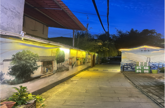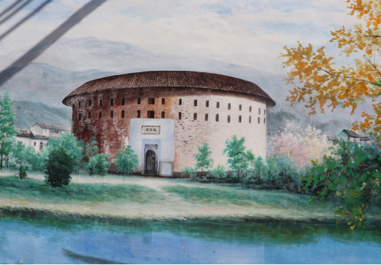 一幅反映客家文化与风情的客家围屋远景图是观背村最有名的墙绘之一。圆形古香古色的围龙楼坐落在小河边,伫立在青山绿水间,在灯光下,墙绘里的水面微澜波动,倒影在水面的客家围屋更加活灵活现,墙绘旁边有三根电线杆,被画成白桦树树杆的模样,一不留神,还以为是白桦树。观背村因地制宜,将创意文化元素融入墙绘,通过墙绘加强乡风文明建设,让游客走进观背村,体验生态之美。