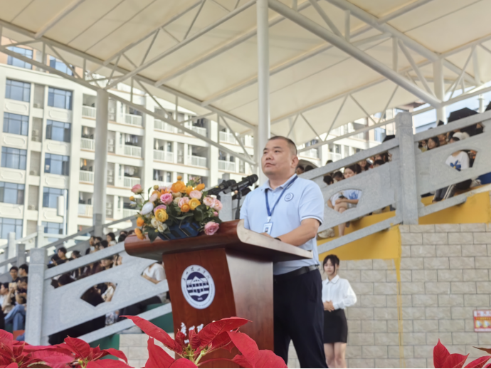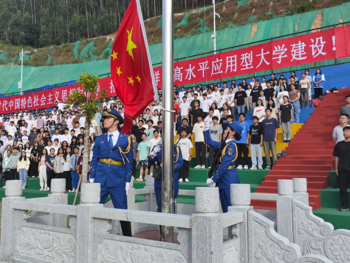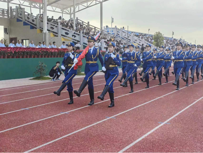 在全体师生的注目下,英姿飒爽的国旗护卫队队员们护送鲜艳的五星红旗进场,伴随着庄严的国歌奏响,五星红旗冉冉升起,迎风飘扬。在场的每一个人向国旗行注目礼,奏唱国歌。一年一度的校运会开幕仪式由此拉开序幕。校长胡社军宣布田径运动会开幕。