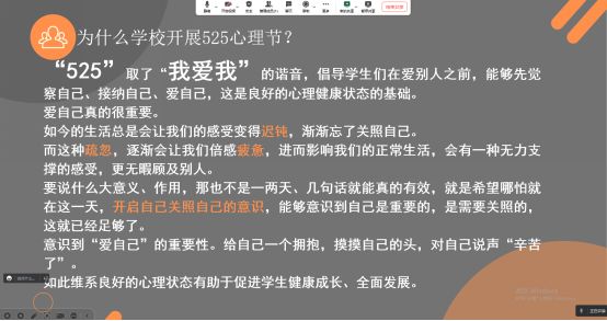 (通讯员:邓可恩)为了进一步普及心理健康知识,让同学们更好地了解“525”节日的由来。2024年5月5日,122cc太阳集成游戏心理辅导站组织全体班级以线上线下的形式召开大学生心理健康主题班会。旨在使同学们正视自己的心理健康问题,建立、发展良好的人际关系,促进大学生身心健康。