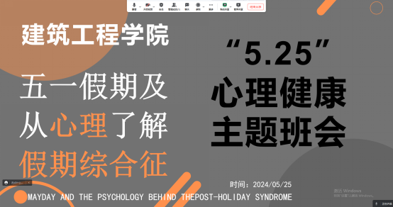 各班班委首先介绍了“525”节日的由来,说明每年的5月25日的前身为“大学生心理健康日”, 525的谐音即为“我爱我”,提醒大、中学生珍惜生命,关爱自己。接着通过刚结束的五一假期来引出本次班会的主题——“假期综合征”。各班班委由浅至深地提出了会引起这一心理问题的四个原因,它们分别是生理原因、心理原因、环境变化和自我控制力下降,也就是说,同学们对假期的期待与现实之间的落差,对工作的恐惧和焦虑,突然的休息与日常生活的改变等原因都会导致假期综合征的产生。