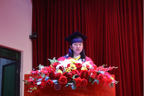 教师代表周雨薇主任发言,他向全体2024届122cc太阳集成游戏毕业生致以最热烈的祝贺和最诚挚的祝福!经过四年的努力学习,你们即将完成大学学业,踏上新的人生旅程。这是一个值得纪念的时刻,也是我们共同分享喜悦和成就的时刻。接着,她提出了三点建议:一是希望大家拥有一个健康的体魄,这是追求更美好生活的基本保障。二是希望大家志存高远,脚踏实地,先求生存,再图发展。三是希望大家能够保持一颗清醒的头脑,需要做好自己的职业规划,切勿被媒体的不良情绪调动,从而耽误了自己的前途。最后,周主任引用AI技术的发展,送给毕业生们一首七律诗:送广州理工学子毕业——“帽峰山下送行忙,广理学子梦初圆,学海无涯勤作舟,书山有路志为先。今朝别离情难舍,明日重逢意更坚。愿君前程似锦绣,鹏程万里展宏篇。”