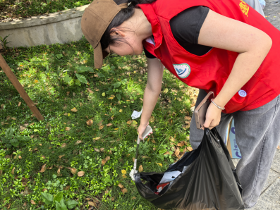 实践团成员拾起草丛中的垃圾