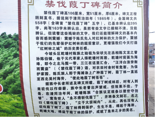 我们的首站,是承载着深厚文化底蕴的省级文物保护单位——坡头区乾塘镇陈氏宗祠。在这里,我们怀着敬畏之心,慕名参观了《禁伐葭丁碑》。据乾塘村村委干部陈辉介绍,乾塘村面朝浩瀚海域,即现今北马围区域,三江汇聚之处,正如宗祠楹联所描绘的“吴江三合,绿环左右,襟带朝阳”,自然风光美不胜收。然而,这江水在滋养大地的同时,也带来了台风季节对海堤与家园的威胁。为抵御自然灾害,陈氏族人世代相传,在海滩上广泛种植红树林,称之为“葭丁”。遗憾的是,清朝年间,北马围的葭丁屡遭砍伐,导致海水倒灌、虫害猖獗、农作物歉收。同治四年(1865年),村中长老汇聚陈氏宗祠,集思广益,立下村规民约,以石碑铭志,严令“乾塘族人等自后永不得斩伐葭丁”,从而有效遏制了滥砍滥伐,保护了这片绿色屏障,使其生生不息,守护着乾塘的海岸线。