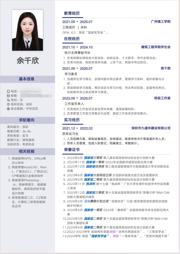 优秀简历 余千欣