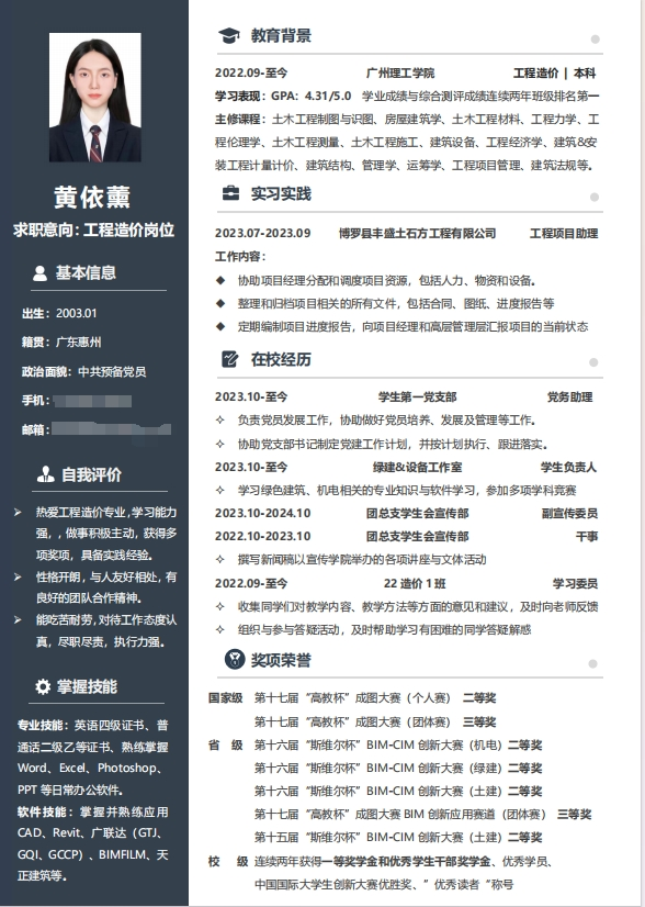 优秀简历 黄依薰