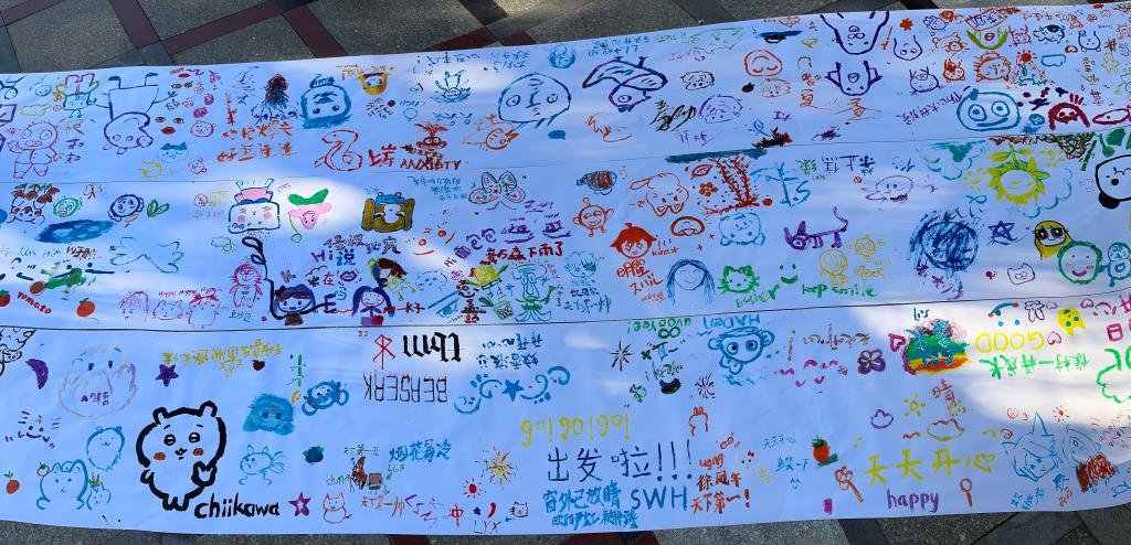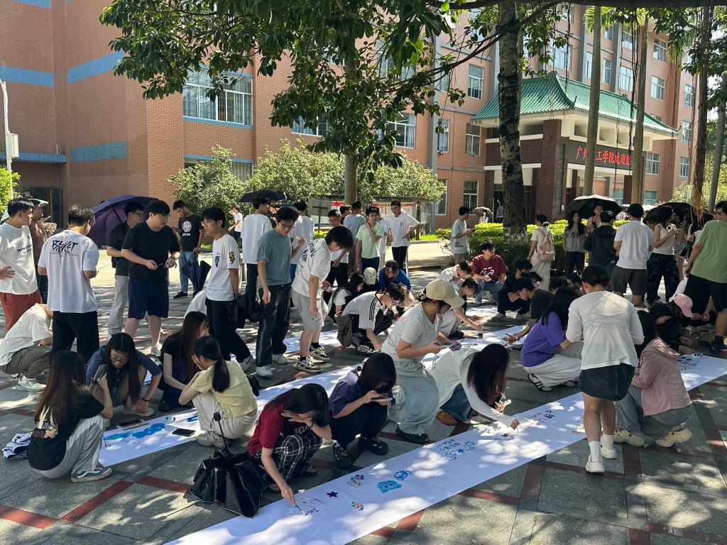 活动于综合楼前广场举行,现场准备了充足的画纸、颜料、彩笔等绘画工具。活动开始前,工作人员有序组织同学们进行现场签到,并向参与者介绍了涂鸦艺术的心理疗愈作用,并鼓励大家放下顾虑,自由表达内心感受。随后,学生们分成小组开始创作,有的选择独自完成作品,有的则与同伴合作交流。
