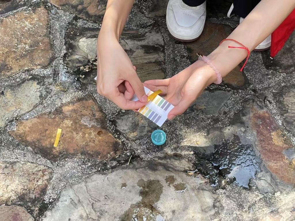 实践团在文典河上游、中游、下游选取三个典型采样点,用清洁容器在水面下10至15厘米处取水,避开岸边漂浮物与沉淀物,确保样本代表性。现场采用pH试纸检测:将试纸浸入水样2-3秒后取出静置5-10秒,通过与标准比色卡比对判定pH值,每个样本重复检测两次以保证数据准确。