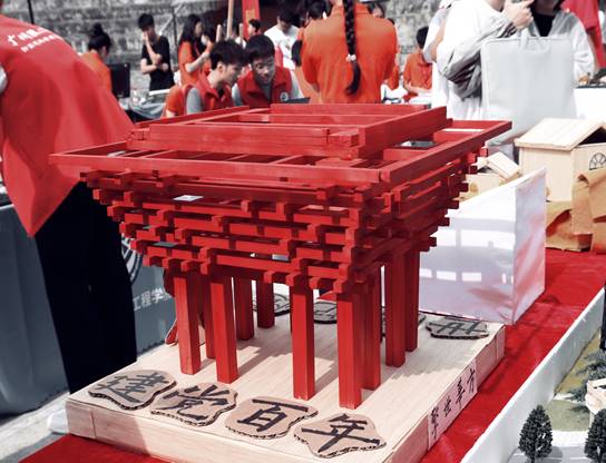 作品“擎世华方”制作的初衷是切合建党一百周年的的主题,选取百年奋斗历程中上海世博会这一光辉时刻为背景,力图通过对上海世博会中国馆的结构简化和再设计,展现中国馆的宏伟。鲜艳的正红色彰显了建党百年的红色主题,展现了百年征程的世博记忆。擎世华方以上海世博会中国馆为原型,又团队成员纯手工制作,历时五天完成。作品用木条模拟其外部轮廓和内部结构,整体形状方正、端庄,擎世华方的名字取意于传统的冠冕和宝鼎,既有东方之冠鼎立华夏之美意,又有擎世而立睥睨寰球的意境。