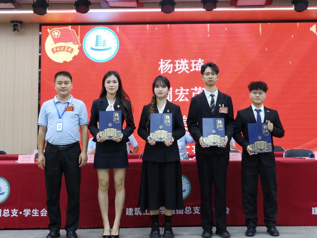 在聘书颁发环节,马冠华书记为第五届团总支副书记及主席团成员颁发聘书;陈丽冰书记为团总支干部颁发聘书;邢禄建老师为学生会干部颁发聘书。