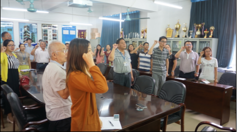 “我是光荣的人民教师。我宣誓:忠诚人民的教育事业,爱国守法,爱岗敬业,关爱学生,教书育人,为人师表,终身学习,争做有理想信念、有道德情操、有扎实学识、有仁爱之心的‘四有’教师。”这是29日下午全体教职员工在“忠诚人民教育事业,争做‘四有’教师”活动中师德师风宣誓的誓词。宣誓完毕,我院李华东书记组织老师共同学习了《广东技术师范学院天河学院关于开展师德建设教育月的通知》【天院(2015)142号】文,并且当场组织全体教职员工签订了《师德师风承诺书》。并将把教师的执行情况作为绩效考核、评先评优的重要依据之一,同时也为我校教师高尚的师德形象提供了有力的保证。本次师德宣誓活动的开展,使老师们感受到了人民教师责任感。教师们纷纷表示要认真做好本职工作,用行动来践行自己的承诺。