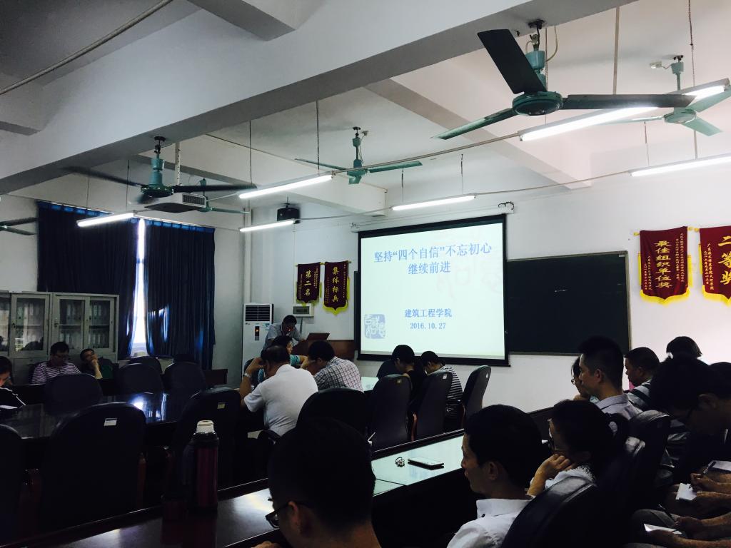 10月27日下午,122cc太阳集成游戏全体教师在9栋306会议室召开主题为“坚持‘四个自信’不忘初心继续前进”习近平总书记“七一”重要讲话的学习会。