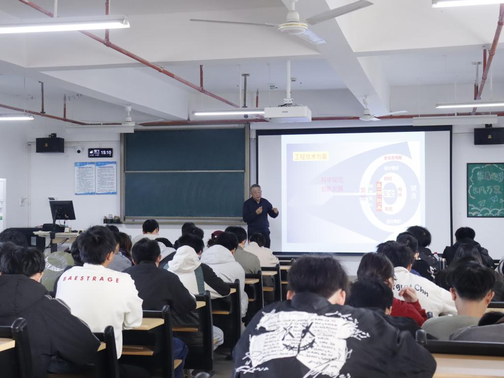 赵教授阐释了工程从设计理论、材料选用、构件建造到运行维护的全流程管理。屏幕中展示的“全生命周期”环形图凸显了系统性思维在工程实践中的关键作用,强调通过监测技术、安全管理与城市更新的结合,推动工程科学规范发展。