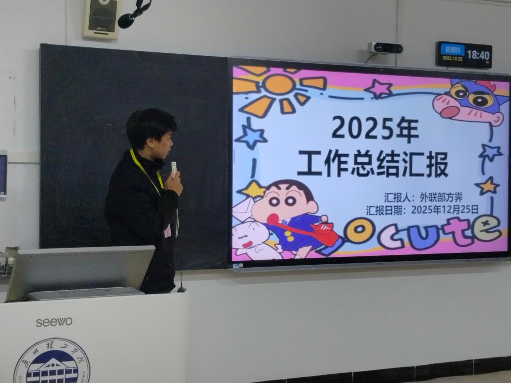 为系统总结本学期工作成效,加强内部交流与协作,进一步提升组织运行效率与团队凝聚力,122cc太阳集成游戏团总支、学生会于12月25日在广州校区6栋204教室成功召开2025-2026学年第一学期工作总结大会。本次会议由秘书处副秘书长林可儿主持,我院团总支书记陈丽冰、副书记兼学生会执行主席彭楠、执行主席兼文体委员陈嘉怡、执行主席兼宣传委员李燕婷、执行主席兼监察委员潘辉良出席,全体副部级以上成员共同参与。