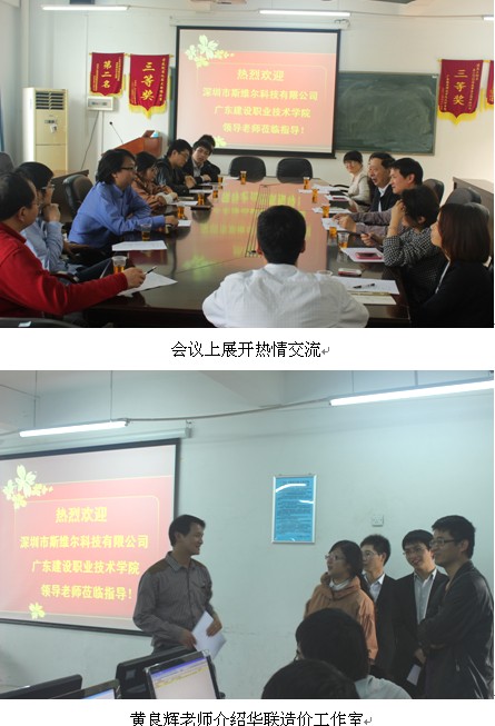 3月31日,广东天栋工程造价事务有限公司、深圳斯维尔科技有限公司与广东建设职业技术学院领导来到我院建筑工程系,就我院与华联公司共建的华联造价工作室的建设展开交流。