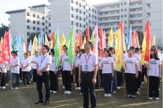 在全体师生的注目礼下,英姿飒爽的国旗护卫队队员们护送鲜艳的五星红旗进场,伴随着庄严的国歌奏响,五星红旗冉冉升起,迎风飘扬。在场的每一个人向国旗行注目礼。校运会开幕式由此拉开序幕。