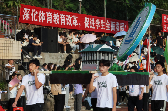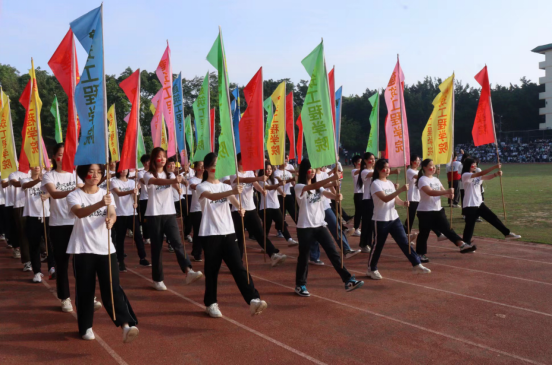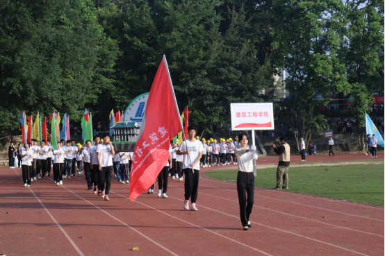 伴随着雄壮的运动员进行曲,国旗队、彩旗队、教工代表队、裁判员代表队及各专业代表队依次进入会场,精神抖擞,意气风发,阔步经过主席台接受领导们的检阅。各学院队伍以整齐划一的步伐、高亢嘹亮的口号向我们展现他们昂扬的精神风貌,展现出青年特有的朝气与活力。