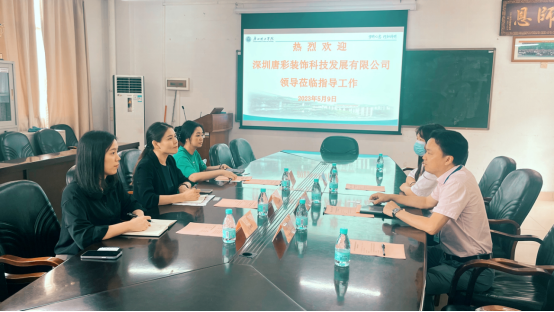 阴凡书记代表学院对深圳唐彩装饰科技发展有限公司刘总一行的到访表示热烈欢迎,并对学校、学院的办学历史、基本概况、办学成果、人才培养特色等方面进行了介绍,重点分享了学院工作室教学特色、学生在各方面的表现,就业等情况。