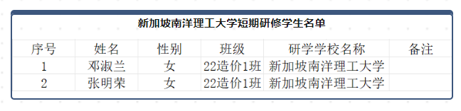 根据《广州理工学院学生处关于选派优秀学生赴南洋理工大学短期研修的通知》,经前期学生自愿报名,学院审核把关,拟推荐邓淑兰等2位同学赴新加坡南洋理工大学开展学术交流活动,拟派出学生名单如下,公示期为2023年10月22日至2023年10月24日。期间若对该名单有异议,请在公示期间内向建工学院办公室反映。反映情况时请签署真实姓名和联系电话,有具体事实;不签署真实姓名或不提供具体事实材料的,将不予受理。