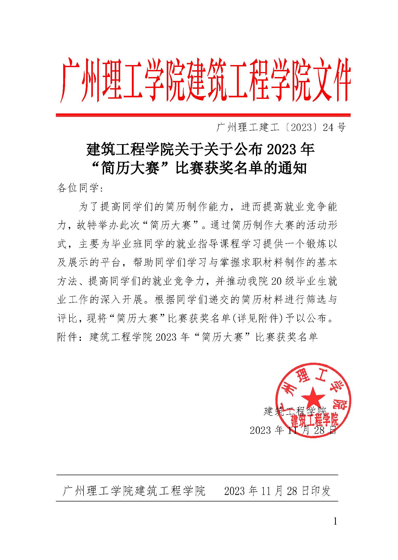 广州理工建工〔2023〕24号-122cc太阳集成游戏关于关于公布2023年“简历大赛”比赛获奖名单的通知