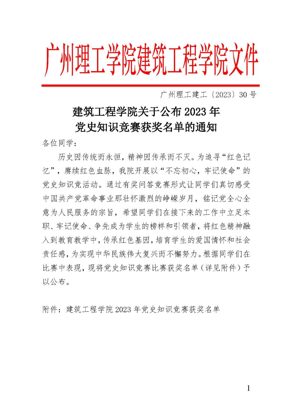 广州理工建工〔2023〕30号-122cc太阳集成游戏关于公布2023年党史知识竞赛获奖名单的通知