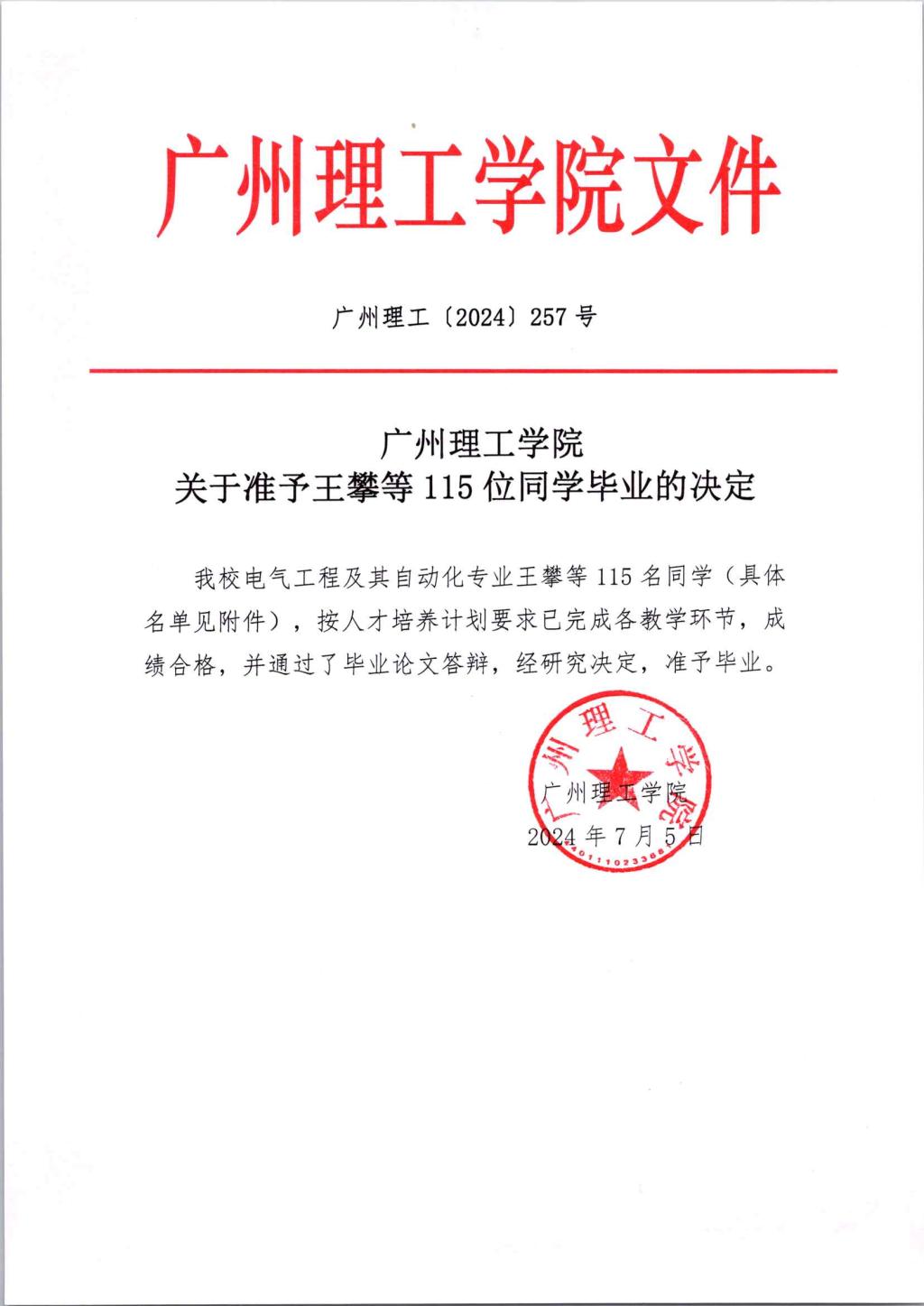 关于准予王攀等115位同学毕业的决定