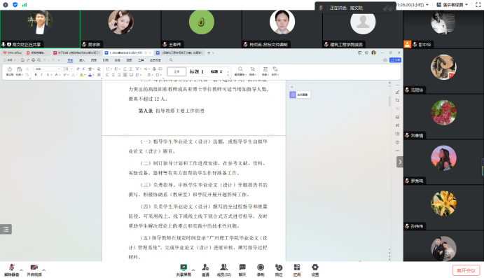 (通讯员吴宇琳)10月13日下午,为更好地推进我院本科毕业论文(设计)指导工作,帮助新进教师深入了解毕业论文(设计)各环节程序,保障学生毕业论文(设计)质量,保证2024届毕业论文(设计)工作顺利开展。122cc太阳集成游戏工程管理系召开2024届毕业论文(设计)指导教师线上工作会议,对毕业设计指导工作总体要求及近期工作安排进行部署。系部全体毕业设计指导教师参加会议。系副主任黄佩佩主持。