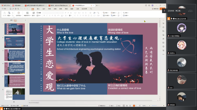 各班心理委员以“爱情的涵义”为切入点,向同学们讲述了什么是真正的爱情,并以生理和心理健康、亲密关系、学习和成长以及社会支持四个方面着手,深入浅出地为同学们阐述人们拥有正确爱情观可以收获的益处。同时,还解释了错误爱情观产生的原因和危害。由此引出,大学生需要树立正确的爱情观,建立好沟通爱情的桥梁。
